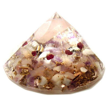ピラミッドの中にはローズクォーツ、クリスタル、ホーライト、マグネタイト、アメジスト、ガーネットが入っており、浄化やヒーリングとともに、深く純粋な愛をサポートすると言われています。オルゴンの力によって浄化力が高まり、ピラミッドの中の波動の高いエネルギーは上の方へスパイラル状に放出されていくので、より効率よくエネルギーも広がっていきます。引き寄せるパワーの強いオルゴナイトを活用するためにも、ぜひ、ポジティブな気持ちで使うようにしてみてください。<使われているパワーストーン>主な石:ローズクォーツその他:クリスタル、ホーライト、マグネサイト、アメジスト、ガーネットこのオルゴナイトは半径約7mの空間に力を発揮します。